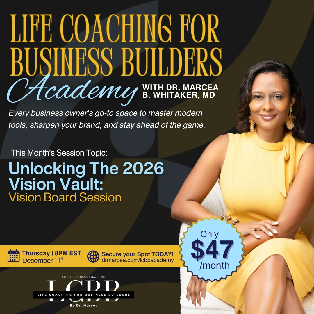 This month inside LCBB Academy, Dr. Marcea is guiding you through Unlocking The 2026 Vision Vault, a transformational vision board session designed to help you see further, believe bigger, and map out the future you’re called to build.